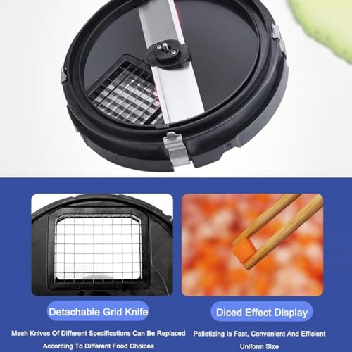 Équipement à deux vitesses : en tournant le bouton, vous pouvez régler les deux vitesses de coupe en fonction de la dureté des ingrédients ou de votre goût préféré. La machine à découper les légumes est équipée de 6 types de moules , 6x6x8 mm/ 8x8x8 mm/ 10x10x8 mm/ 13x13x8 mm/ 15x17x8 mm , qui peuvent être remplacés à volonté. Divers fruits et légumes coupés à la taille dont vous avez besoin